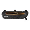 Rahmentasche mit wasserdichtem TIZIP Reißverschluss (überarbeitete Version) auf der rechten Seite; ideal für die Kombination mit Trinkflaschenhalter im Rahmendreieck; 5 austauschbare und individuell positionierbare Klettbänder zur Befestigung am Oberrohr, Sattel- und/oder Unterrohr; abriebfestes, PU-beschichtetes Nylongewebe; geeignet für Montage an Carbon-Rahmen.